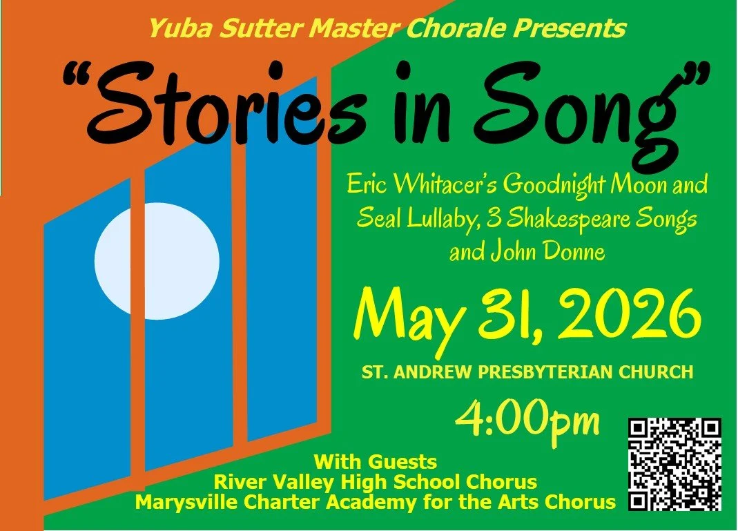 Rehearsals for the upcoming Spring Season for the Yuba Sutter Master Chorale, “Stories in Song” began on Tuesday, February 3, 2026, from 7:00 to 9:00 p.m. at First Lutheran Church, 850 Cooper Ave., Yuba City. There’s still time to join, so come at 6:50 to sign in and pick up your music. Our Music Director is Carolyn Steele and our Accompanist is Marina Swales. The concert date will be Sunday, May 31, 2026 at 4:00 p.m. at St. Andrew Presbyterian Church, 1390 Franklin Road, Yuba City.